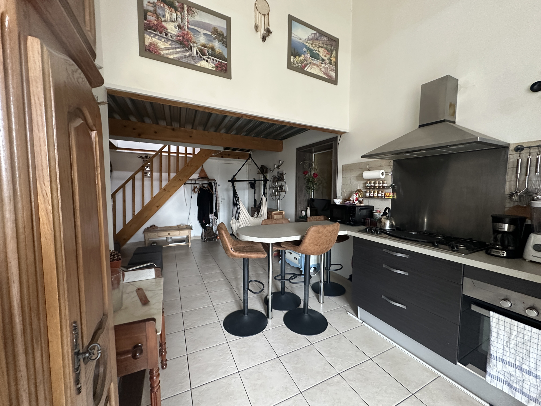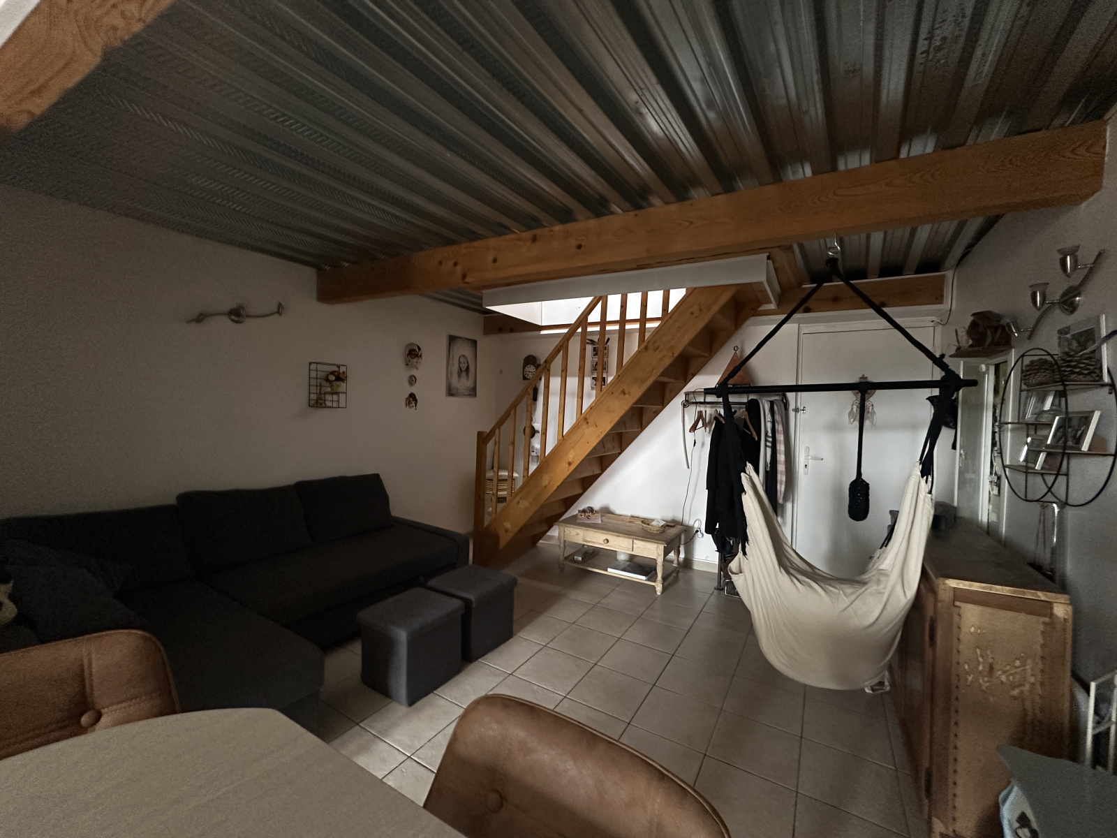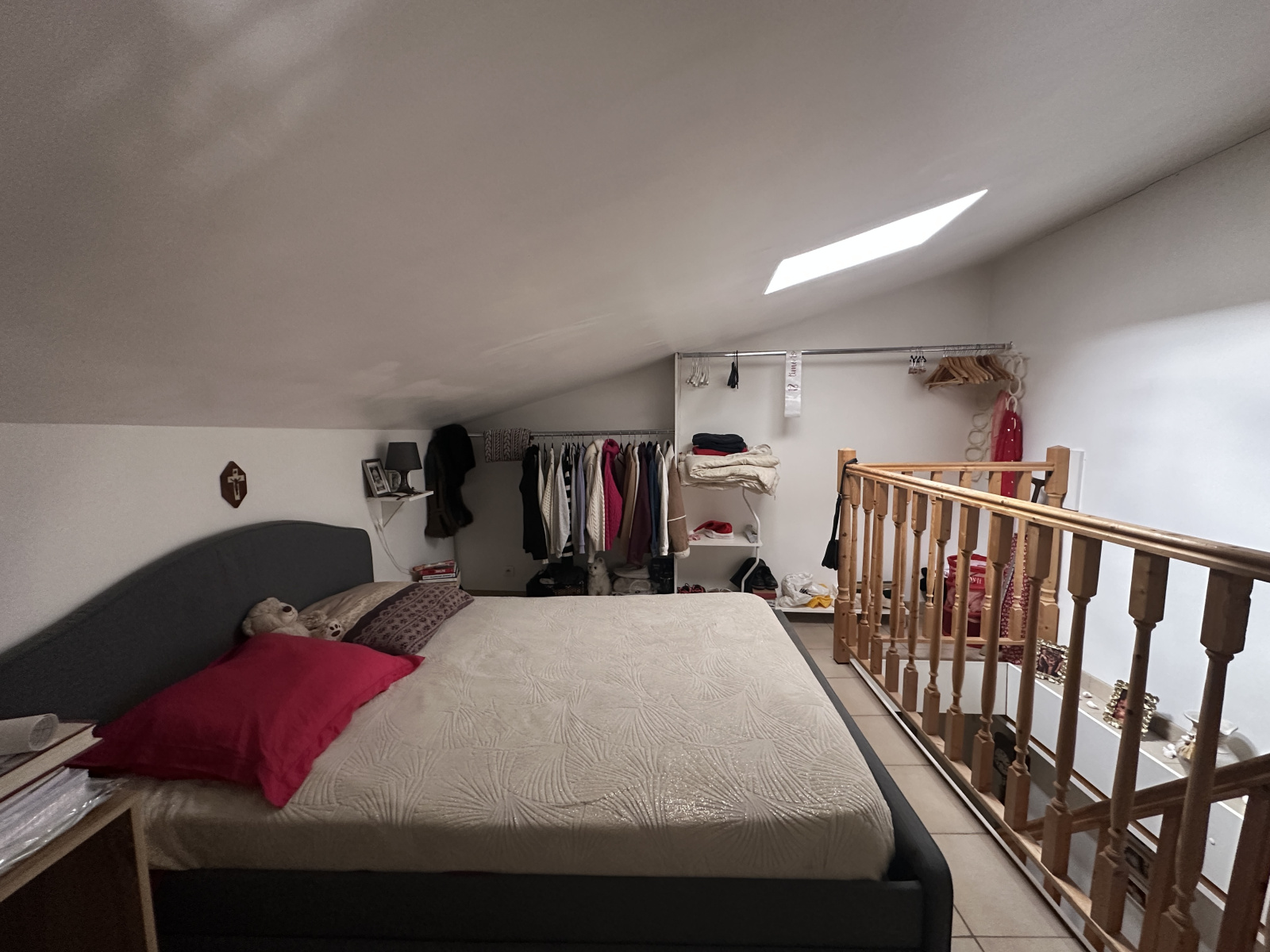 A l'étage une mezzanine avec une chambre mansardée avec fenêtre de toit.