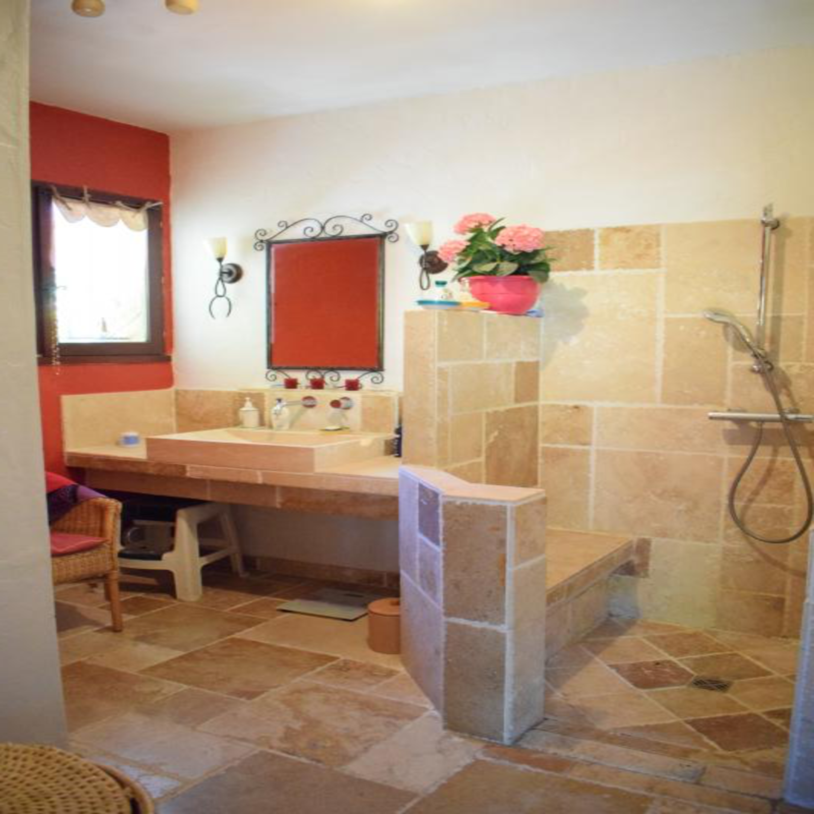 Neuve en travertin douche à l'italienne - placards - sèche serviette