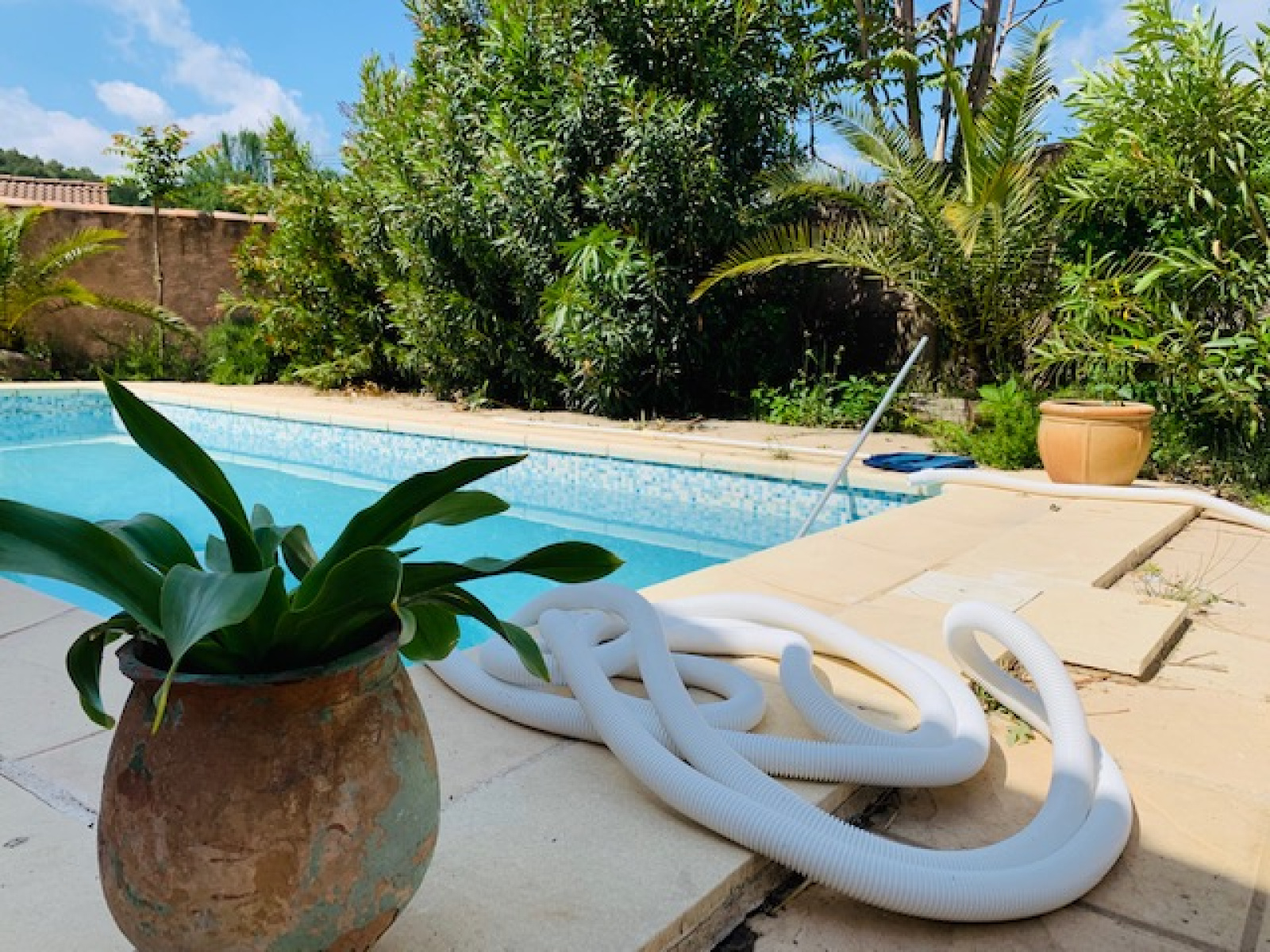 A l'étage : 1 chambre, un bureau mansardés, et un point d'eau avec lavabo et wc. Un garage attenant avec cellier/buanderie et mezzanine. Piscine et sa plage autour. terrain clos et paysagé de 431 m2. Coup de coeur.