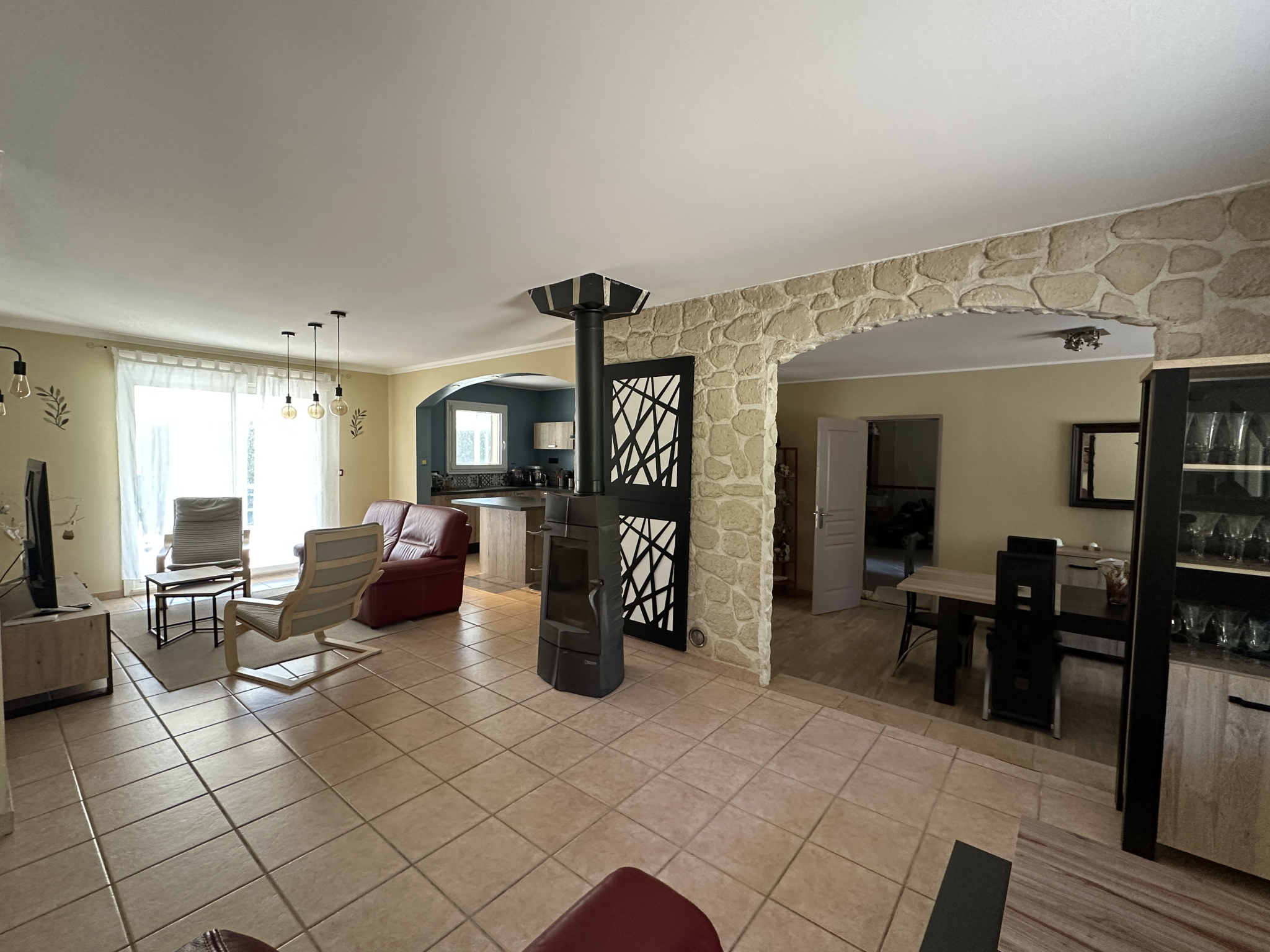 Une entrée avec placards, un séjour composé d'un salon 2 salles à manger une cuisine équipée ouverte avec ilot neuve, 3 chambres, wc indépendants, une salle d'eau. Un Studio indépendant composé d'une chambre et une salle d'eau avec wc. Un garage attenant et communicant carrelé et isolé. Terrain clos plat arbiré et payqgé, des terrasses une piscine une véranda.