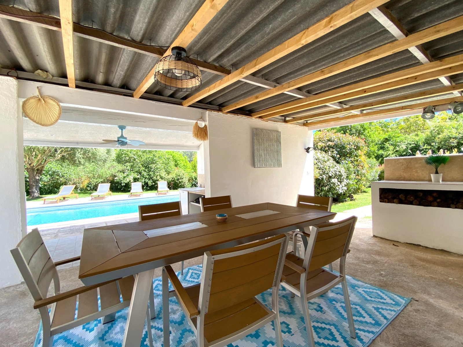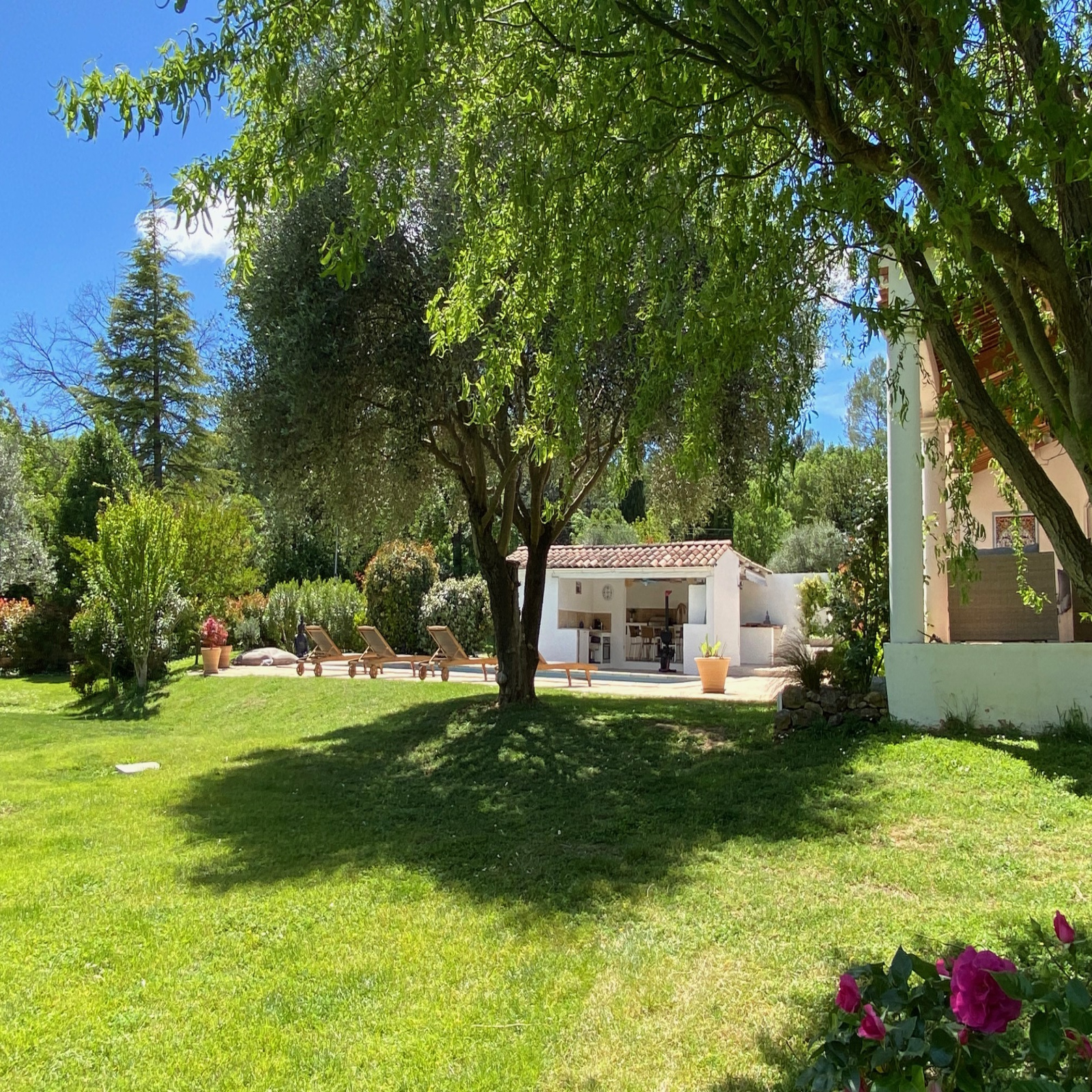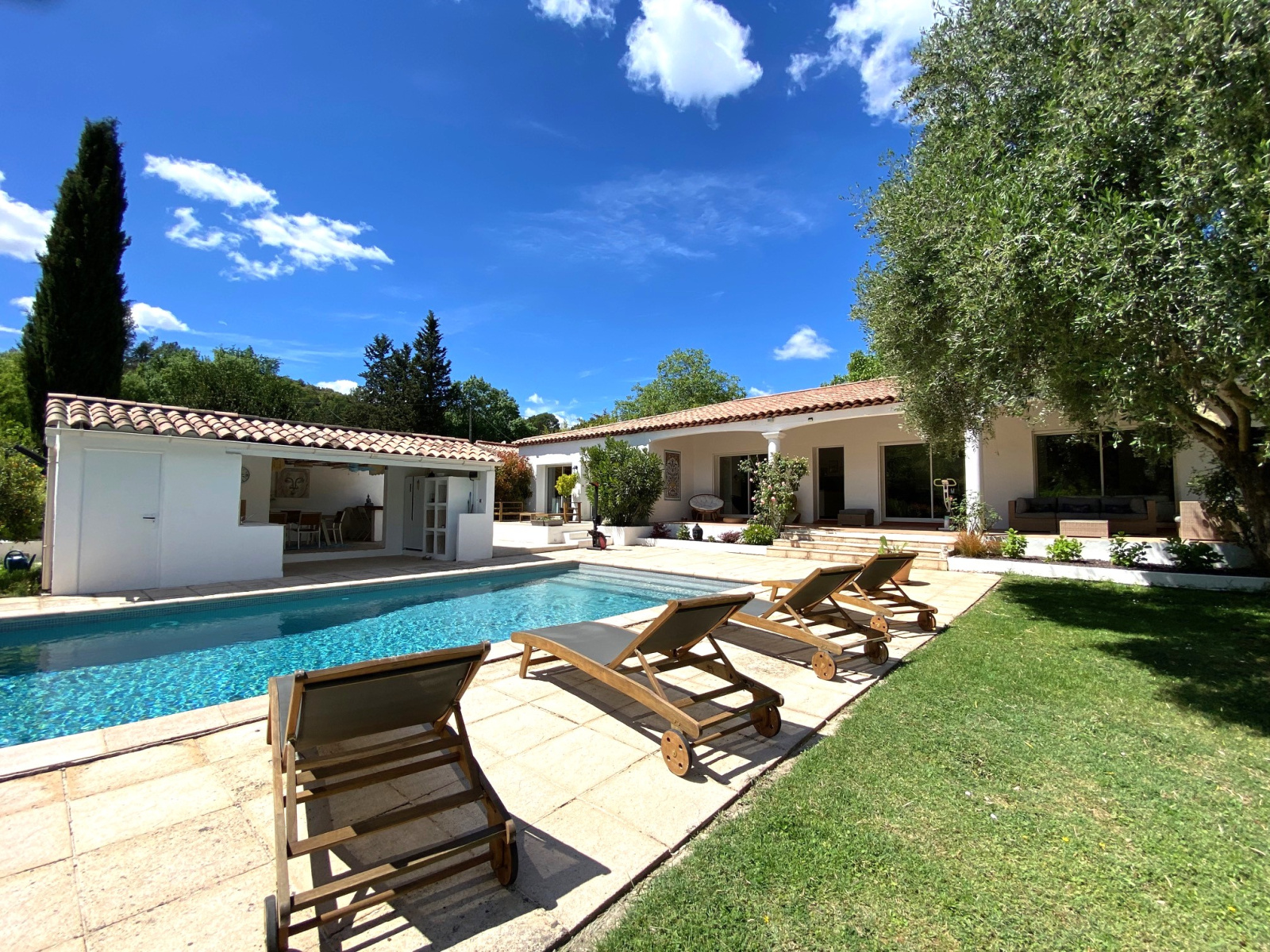 Cette élégante propriété séduit par ses volumes intérieurs, son environnement et ses équipements extérieurs. Beau volume pour le séjour avec cuisine équipée ouverte orant une très belle charpente apparente et une uminosité grâce aux larges baies vitrées s'ouvrant sur la terrasse couverte, le jardin et l'espace piscine. Grande chambre équipée d'un dressing, salle de bain avec bain à balnéo et douche, deuxième chambre, cellier / buanderie. Bien séparé de l'espace de vie, deux chambres dont une chambre double, une salle d'eau et des toilettes. Un confortable espace ...