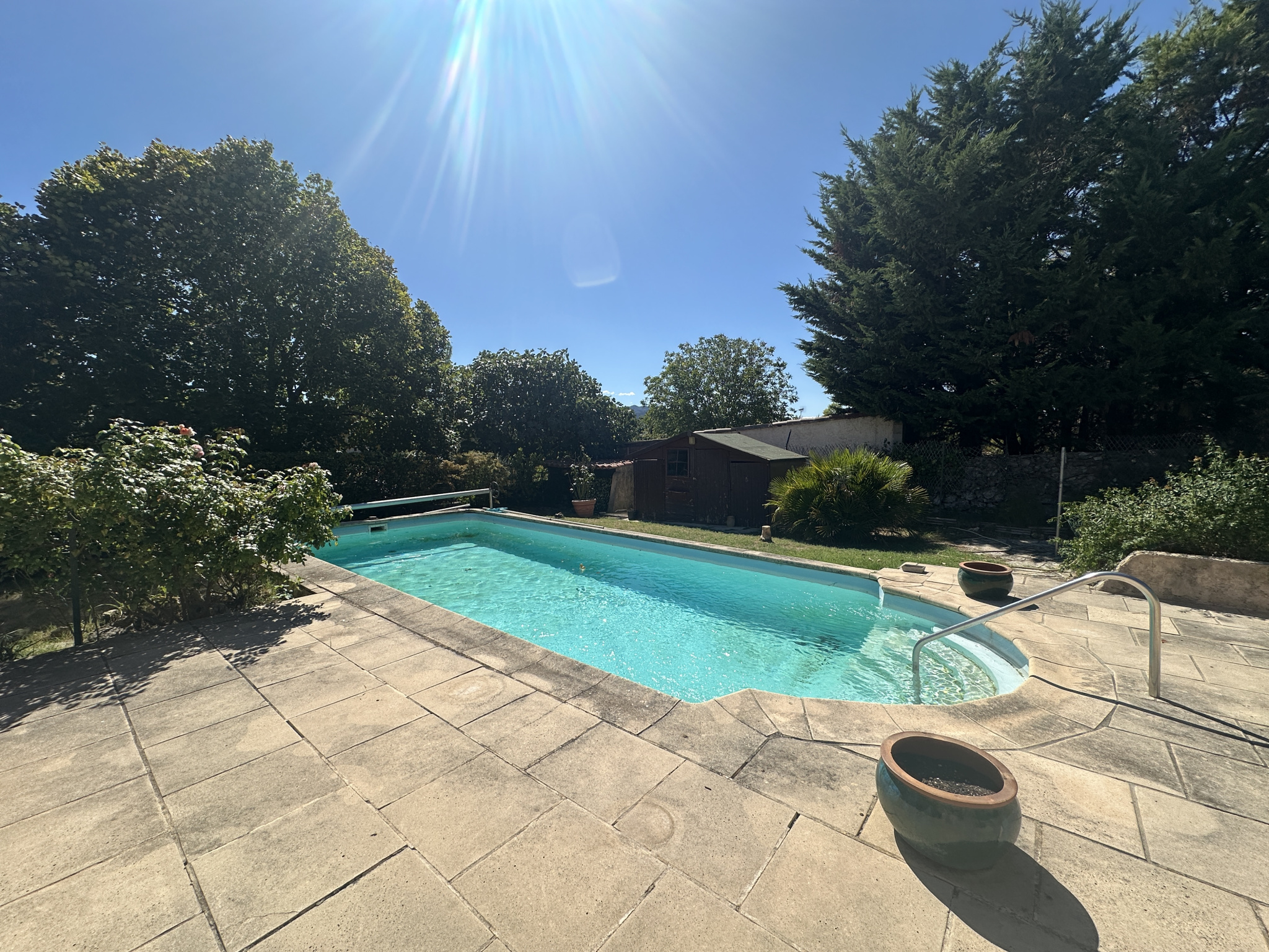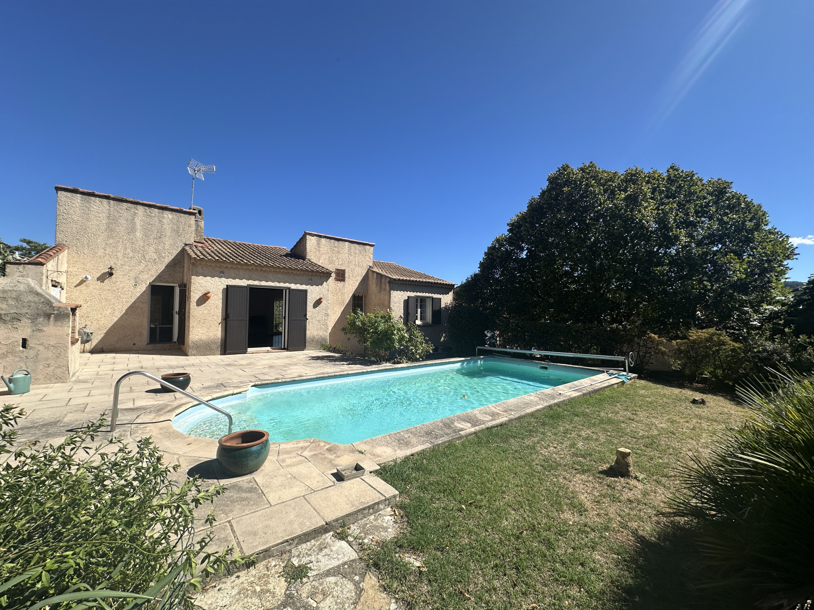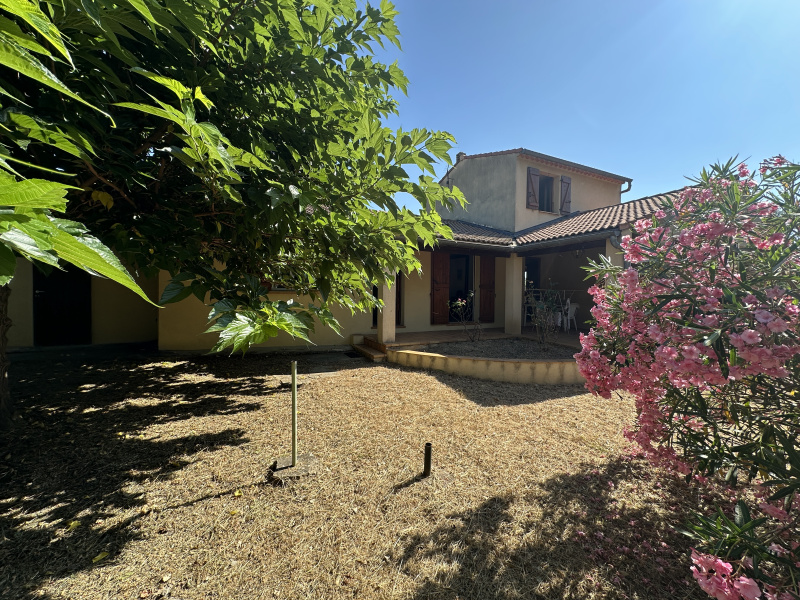Une entrée ouverte sur une cuisine meublée et équipée, un séjour avec cheminée, 2 chambres, une salle de bains et wc indépendants. Une véranda et garage. Une piscine. Des terrasses - terrain autour de 600 m2 entièrement clos.